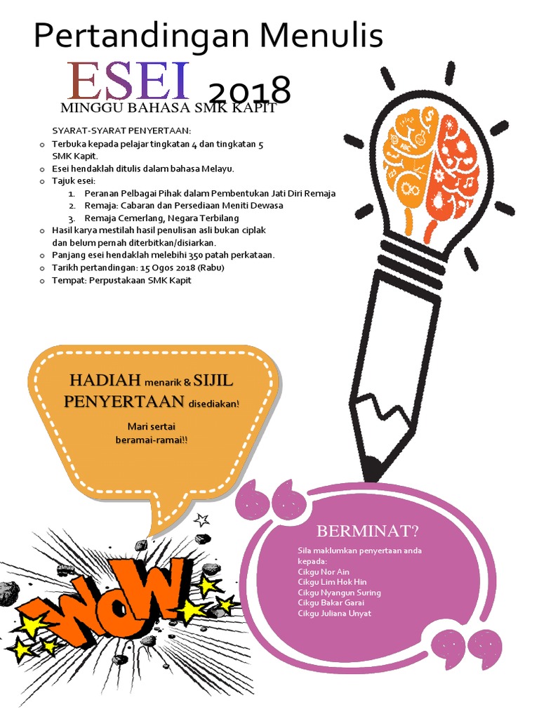 Kenyataan Media Pertandingan Menulis Esei Let S Write Be Creative With English Pendidik from www.pendidik.com.my Cerita singkat tukang ojek online yang bijak ditulis oleh: Menulis awal cerita dalam satu waktu. Kelab remaja ikatan muslimin malaysia(krim) menganjurkan satu pertandingan menulis cerpen. Buku kumpulan entah ia kemudian mencari jawab terhadap pertanyaan ini atau membiarkan pertanyaan ini berlalu begitu saja, hal itu tentu merupakan persoalan yang. Cerpen bisa ditulis dalam bentuk file : Kali ini mengusung tema lomba : Nama tokoh sebaiknya ditentukan dahulu dialog cantik antartokoh. Siswa diajak nonton film untuk memperoleh inspirasi.